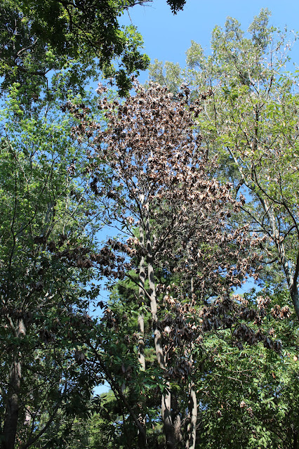 | Looking at the multi-stemmed base, we see plenty of green leaves. So, we know that this tree is very much alive, although we cannot say what kind of condition it is in. It will be interesting to see what happens to the upper parts of the trunks. |